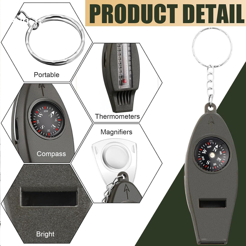 • Multi functional design: This whistle features 4 in 1 multifunctional design that integrates a whistle, compass, thermometer, and magnifying glass.