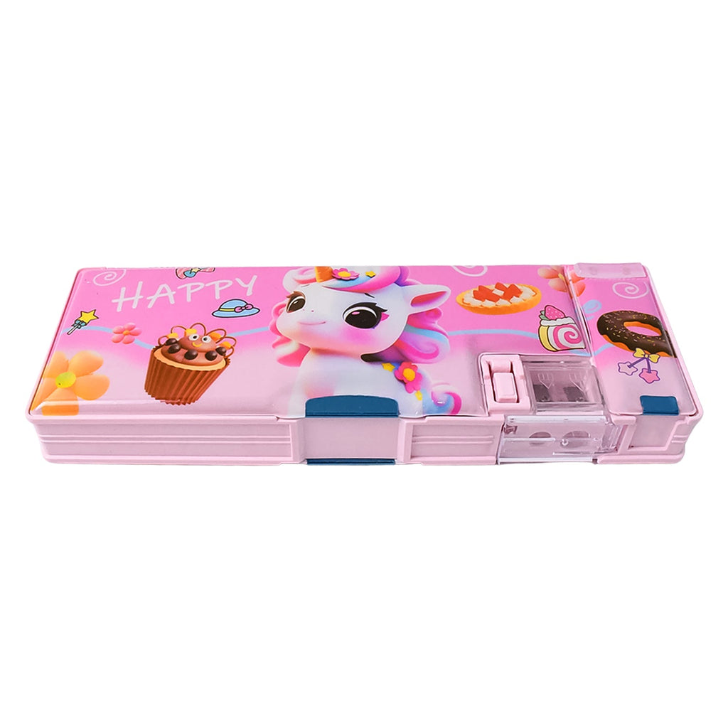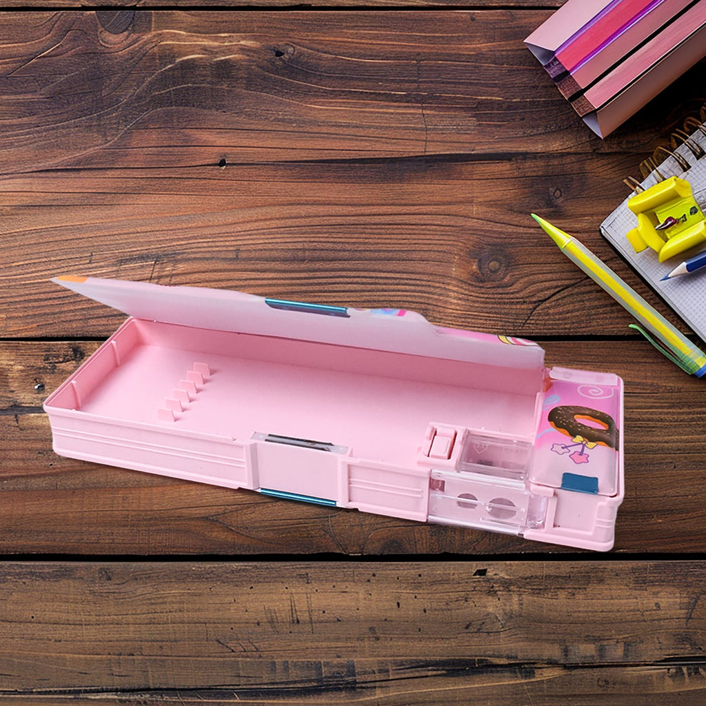 Magnetic Multipurpose Compass Box With Sharpener, Plastic Double Deck Pencil Case with 2 Compartments, Supplies Utility Box Storage Organizer, Pencil Box for School, Cartoon Printed Pencil Case for Kids, Birthday Gift for Girls & Boys (1 Pc)